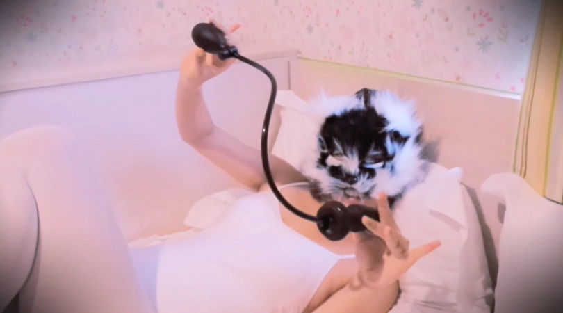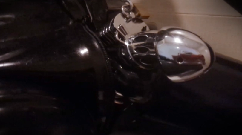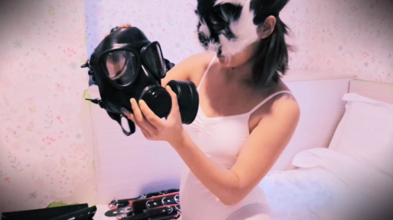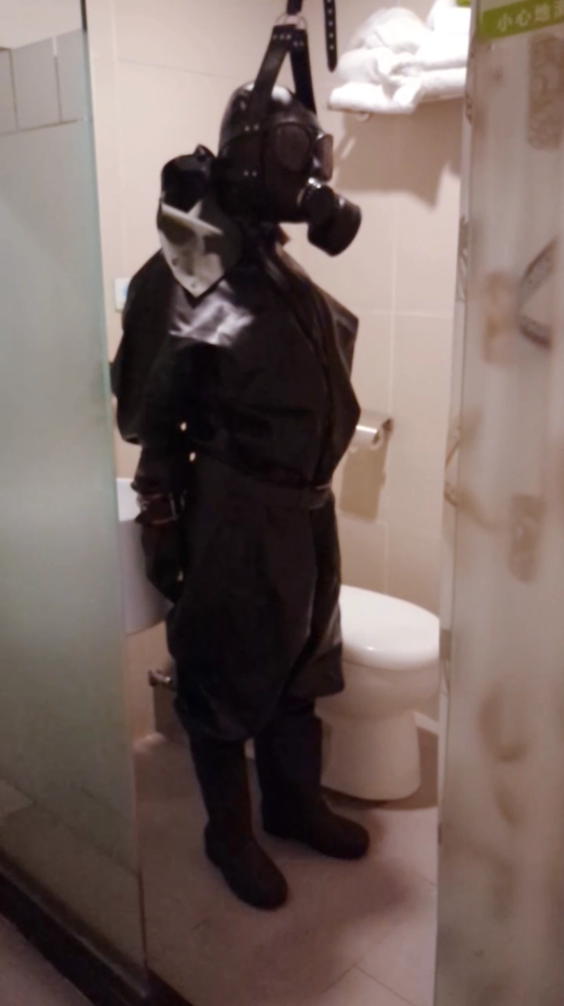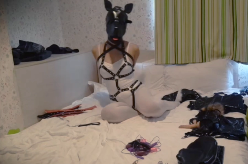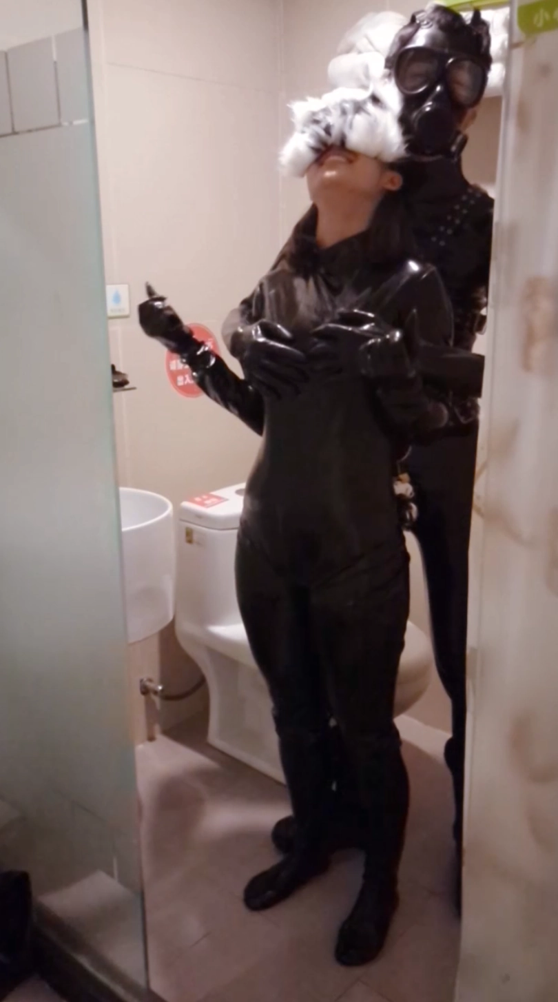 拍摄过程中,为了满足她的好奇心,就连我也被她要求穿上了乳胶紧身衣、拘束带、防毒面具甚至是贞操锁......紧接着就是给她各种穿戴着来玩:狗狗头套、防毒面具、下水服、口塞、带牙套笔管的头套......